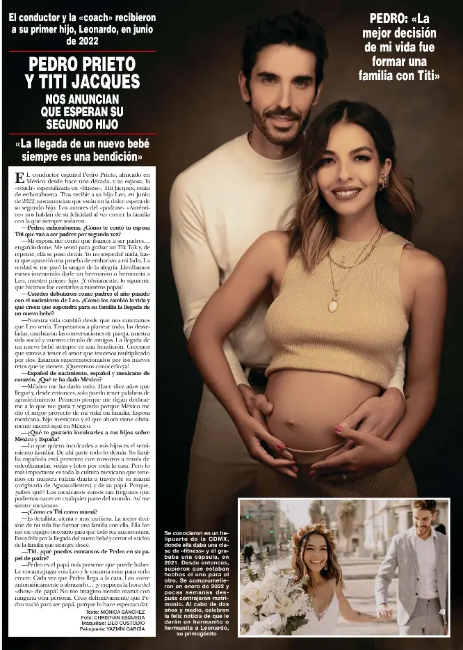EL conductor español Pedro Prieto, afincado en México desde hace una década, y su esposa, la «coach» especializada en «fitness», Titi Jacques, están de enhorabuena. Tras recibir a su hijo Leo, en junio de 2022, nos anuncian que están en la dulce espera de su segundo hijo. Los autores del «podcast» «Auténtico» nos hablan de su felicidad al ver crecer la familia con la que siempre soñaron.